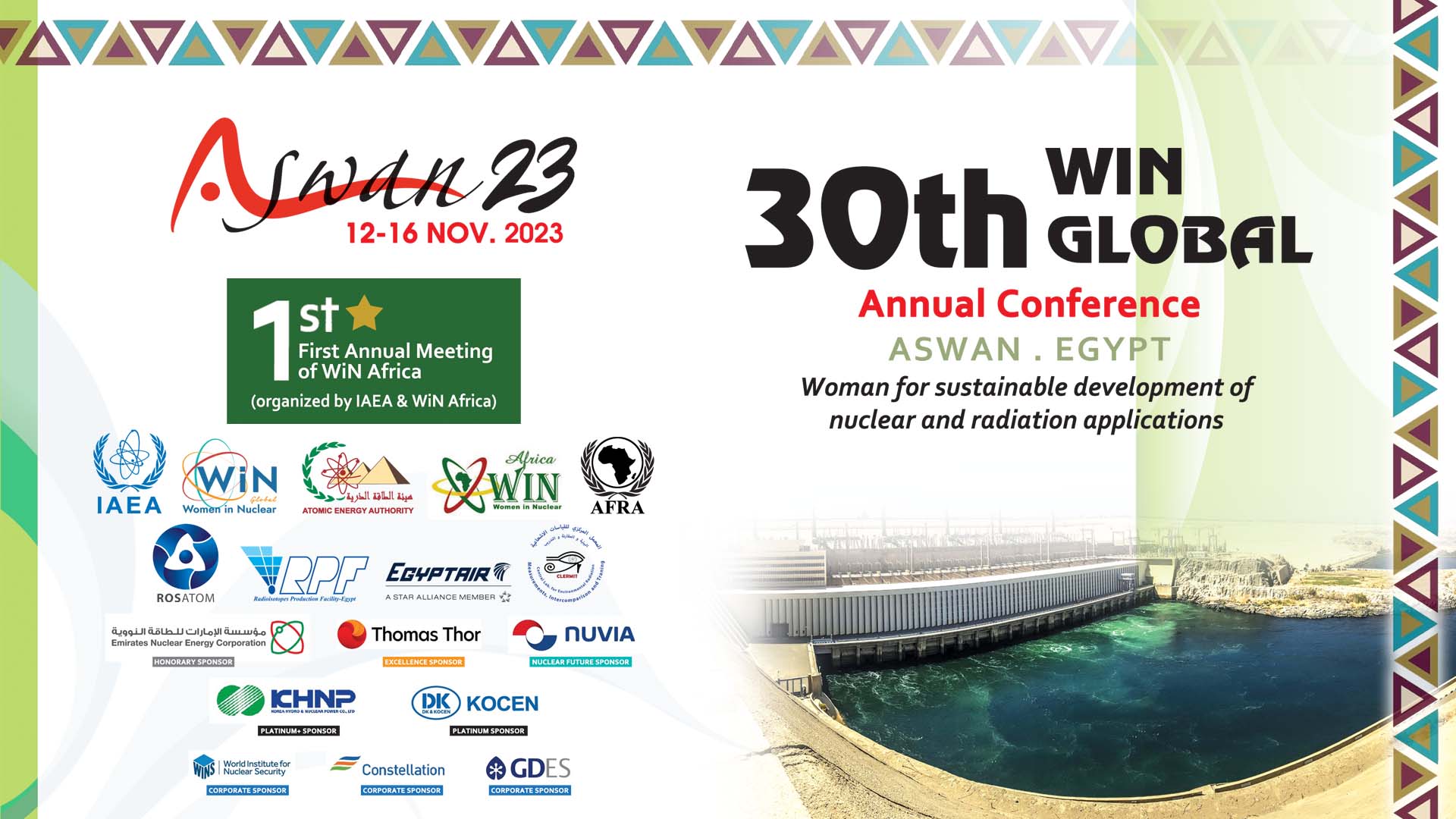 It is a pleasure for us to welcome you to attend 30th WiN Global Annual Conference jointly with First Conference for Women in Nuclear Africa 12- 16 November 2023 Aswan – Egypt.